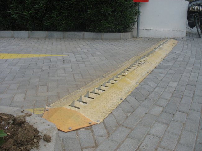 Однако разгадка оказалась рядышком: поперек въезда на площадку находилось непреодолимое для машин препятствие, «лежачий полицейский», оснащенный острыми зубцами-лезвиями. Чтобы проехать через эту гребенку не пропоров шины, нужно предварительно опустить зубцы при помощи специального механизма, приводимого в действие ключом, который имеется только у тех водителей, кому разрешен въезд на площадку.