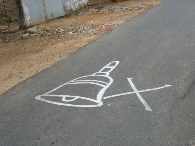 В Шри-Ланке приспособились экономить на дорожных знаках. Некоторые из них – те, которые запрещают подавать звуковые сигналы (а тамошние «водилы» большие любители погудеть!), — заменили специальным графическим изображением, сделанным прямо на асфальте: колокольчик и запрещающий крест рядом с ним.