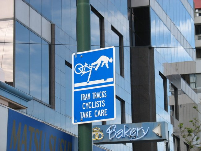 Вот, например, в нескольких крупных городах Новой Зеландии, где сохранилось трамвайное движение, людей, едущих на байках, информируют о том, что рядом находится рельсовая колея, угодив колесом в которую можно упасть. Для этого на перекрестках развешаны особые таблички-пиктограммы.