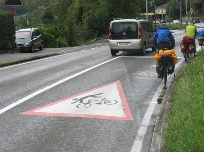 А в Австрии на дорогах со специально выделенной полосой для велосипедистов регулярно встречаются знаки, призывающие соблюдать осторожность, чтобы не упасть на опасном участке. Такие изображения-предупреждения крупно нарисованы на асфальте.