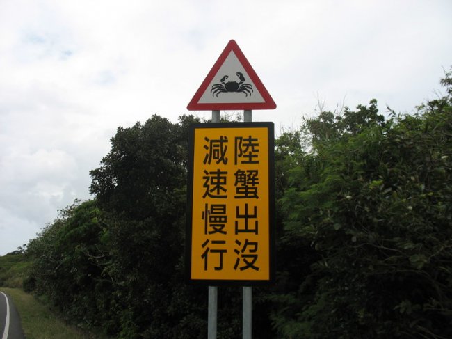 Во время поездки по Тайваню немало удивления вызвали несколько раз встретившиеся на шоссе дорожные знаки с изображением краба . Специально решили притормозить, осмотреться. Кромка морского берега в нескольких сотнях метров, по другую сторону дороги и вовсе заросшие травой поляны, рощицы деревьев… Так почему же здесь «осторожно - крабы»? Неужели эти проворные ракообразные вдалеке от привычной им водной стихии через дорогу по каким-то своим делам шастают? Увы, объяснения ситуации, данные на китайском языке, отгадать эту загадку не помогли.