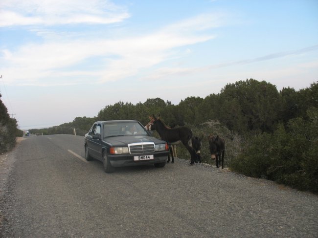 А в мусульманской северо-восточной части Кипра (территория не признанной никем кроме Турции, так называемой Турецкой республики Северного Кипра) имеется свое широко разрекламированное здесь для заезжих туристов и удостоившееся персонального дорожного знака животное. Причем это отнюдь не какие-нибудь там экзоты, а обыкновенные ослы. После военных действий 1974 года, закончившихся отторжением при участии турецких войск северной части острова от Республики Кипр и отъездом отсюда почти всех христиан, их сельские дома остались без присмотра. Содержавшиеся в некоторых хозяйствах в качестве тягловой силы ослики оказались в результате на воле. С течением лет они одичали и теперь ведут абсолютно независимый от человека образ жизни. Правда хитрющие ишаки понимают, где можно поживиться, и регулярно «тусуются» у обочин шоссе, выклянчивая у проезжающих угощение.