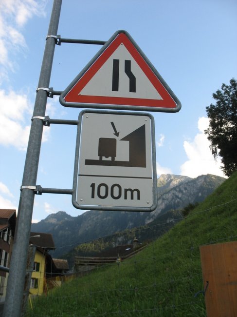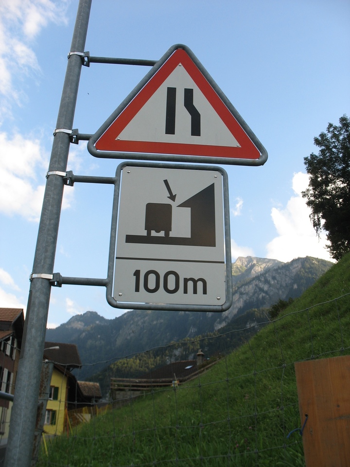 Например, в горных селениях Швейцарии водителей грузовиков подстерегает опасность столкновения с препятствием. Улочки здесь, как правило узкие, а у домов, выстроившихся близко к обочине, согласно традициям местной архитектуры крыши выступают далеко за линию стен. В итоге зазевавшийся шофер фургона может зацепить верхом своего кузова за край свеса такой крыши. Чтобы этого не произошло, на въезде в альпийскую деревню часто можно увидеть знак «Сужение дороги» и под ним табличку, иллюстрирующую ситуацию: дом, с выступающей в сторону проезжей части крышей и силуэт грузовой машины рядом с ним.