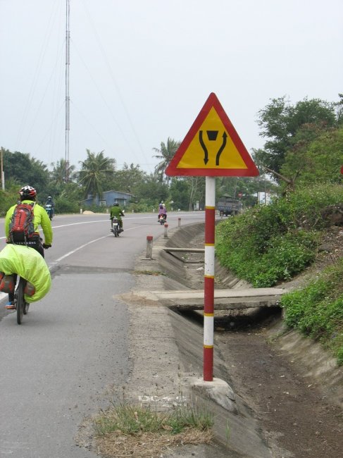 Во Вьетнаме местная автоинспекция почему-то особенно озаботилась предупреждением водителей о появлении впереди на дороге широкой разделительной полосы. Для этого даже узаконили особый предупреждающий знак.