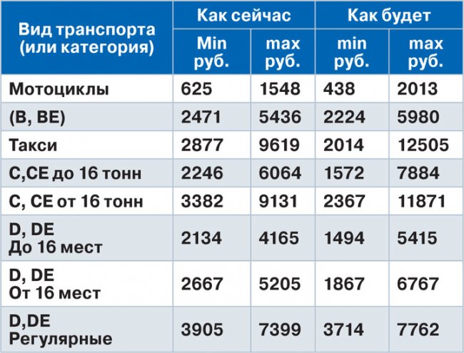 Новые минимальные и максимальные базовые тарифные ставки ОСАГО содержатся в проекте указания Банка России. Планируется, что после одобрения нового документа действующая сейчас версия утратит силу. Изменения коснутся всех категорий транспортных средств. Причем речь идет не только о повышении максимальной ставки, но и о понижении минимума. Однако если для большинства видов транспорта изменение границ тарифного коридора существенным не будет, то для легковых такси «потолок» ставок увеличится довольно серьезно.