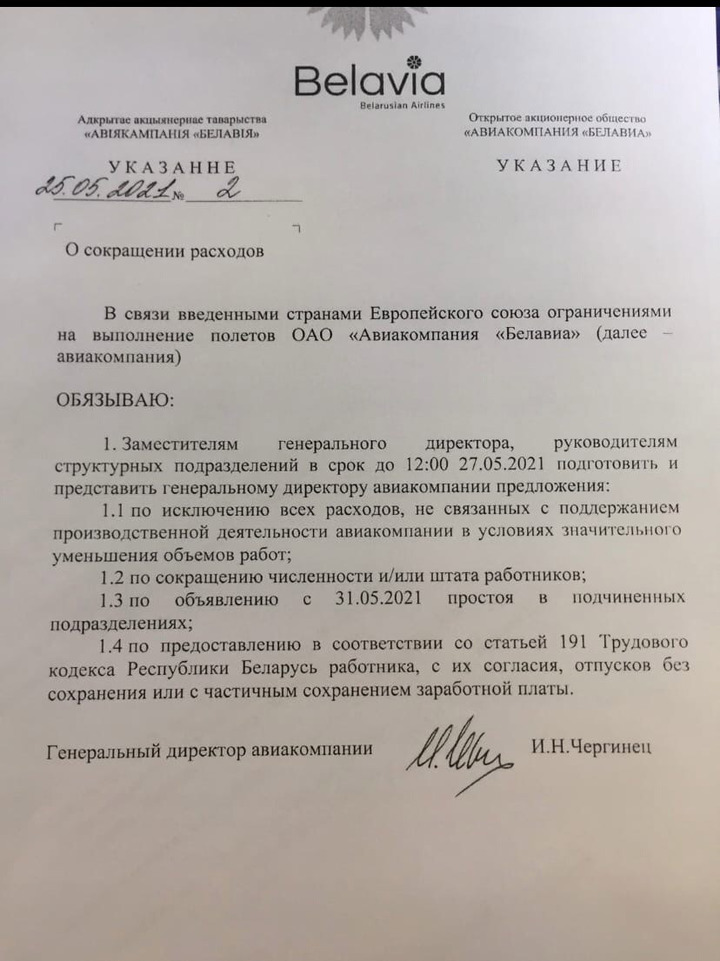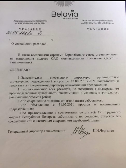 Нам удалось связаться с сотрудниками «Белавиа». По их словам, во вторник в рабочий чат всем работникам авиакомпании разослали сообщение о сокращении штата, зарплат и вынужденном отпуске. Документ, подписанный генеральным директором авиакомпании, оказался в распоряжении «МК». Приводим текст: