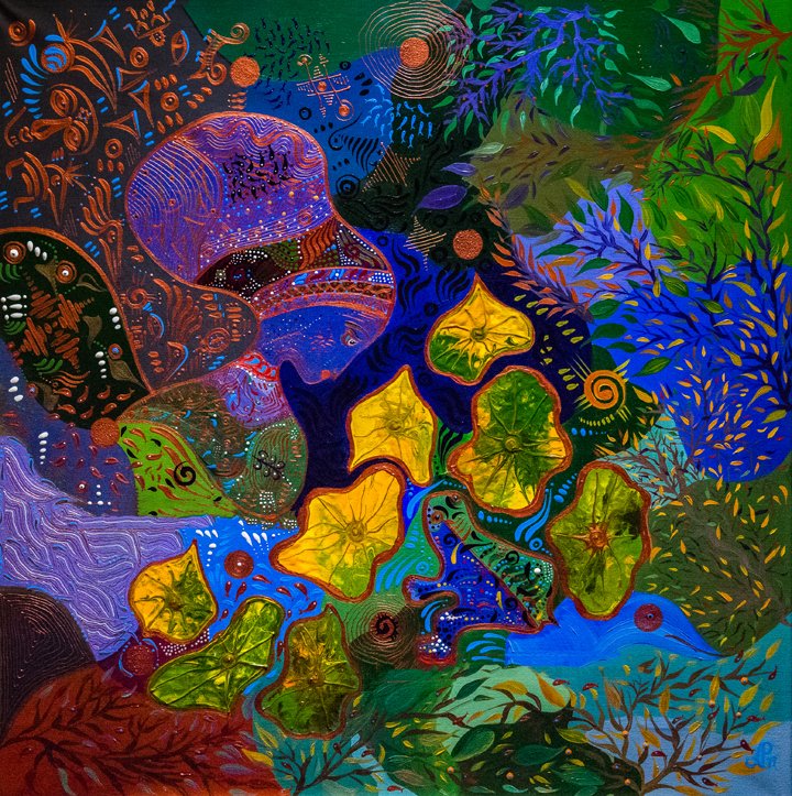 Я работаю в разных техниках, в том числе смешанной, которая предполагает использования почти всего, что попадается на глаза: кусочков стекла, ткани или металла, фрагментов дерева, африканских масок и пр., с таким арсеналом выразительных средств я могу самоизолироваться и спокойно работать очень долго, а когда закончатся краски, буду рисовать углями из костра.