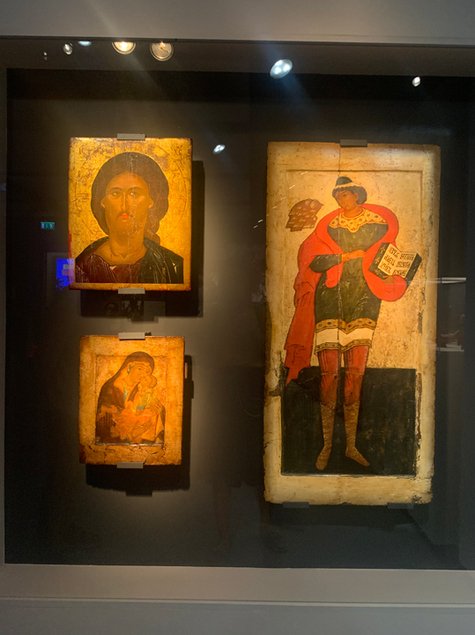 Здесь же в витрине несколько неочевидных вещей из коллекции – три редкие иконы, которые теперь входят в собрание Музея Андрея Рублева (одна из них – времен Ивана Грозного), и несколько недетских игрушек (например, Николай II) из музея-заповедника Царицыно. Уезжая в 1970-х годах на историческую родину в Грецию, Костаки подарил огромную часть своего собрания советским музеям. Большая часть, около 900 работ, попали в Третьяковку, другие разошлись по тематическим музеям.