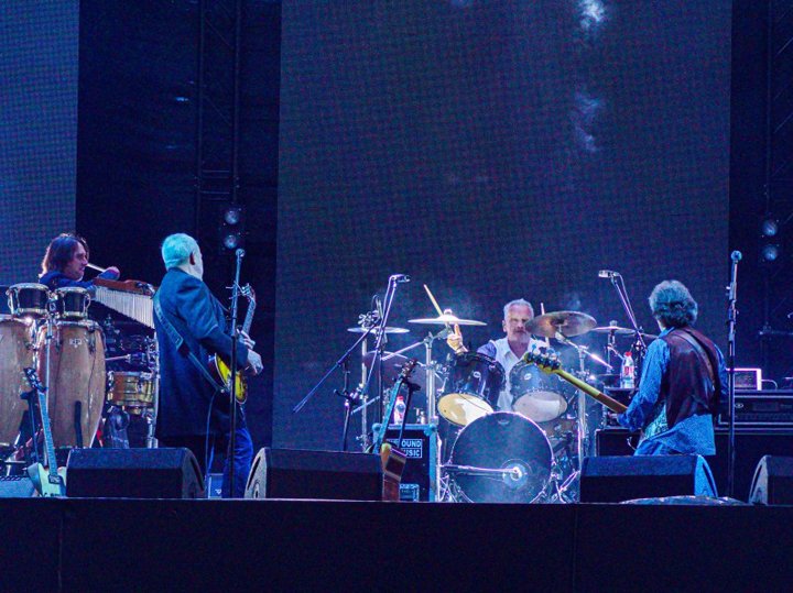 «Машина Времени» вышла на сцену, когда начали сгущаться сумерки. Наступающая ночь и постепенно нарастающая яркость сценического света — отличная составляющая рок-действа, хотя насчет рока необходимо сделать важное пояснение. Концерт drive-in — своего рода переходная форма между онлайн-трансляцией и полноценным концертом. То есть это еще не живое выступление во всей его мощи, прежде всего относительно звука. Подразумевается, что вы наблюдаете за происходящим из машины, а звук идет через радиоприемник, настроенный на определенную частоту. Можно смотреть и слушать и за пределами авто, но звук будет хуже, потому что сцена не оснащена порталами колонок, а мониторы, которые установлены для музыкантов, дают искаженную звуковую картинку. Зрелище выходит несколько сюрреалистическим, и в итоге у публики на таких мероприятиях практически нет шансов получить полноценные концертные впечатления, когда вы выходите после двухчасового рок-замеса оглушенные и счастливые одновременно.