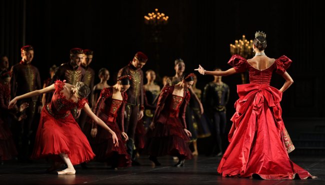 Не создали Ангелина Атлагич и художник по свету Брэд Филдс и никакого контраста между актами. Цвета несколько монотонные, пастельные, с вклинивающимися пятнами-взрывами, вроде кроваво-красного платья Королевы-матери в сцене бала.