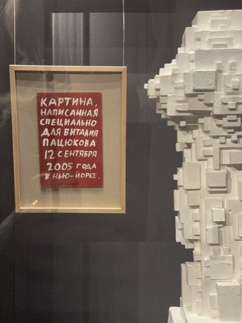 Обо всем этом свидетельствуют работы таких мэтров, как Илья Кабаков, Эрик Булатов, Дмитрий Пригов, Владимир Немухин, Виктор Пивоваров, Эдуард Штейнберг, которые можно найти в еще одной витрине. Это те самые легендарные шестидесятники, с которыми дружил и работал Пацюков, когда после института с головой окунулся в неофициальное искусство (окончил он, кстати, Московский авиационный институт и Московский технологический институт легкой промышленности по специальности «художественное проектирование» в 1964 году). Многие из этих работ созданы специально для Виталия. Такова, например, работа Булатова, где в центре белого хоста только одно слово: «Пацюков».