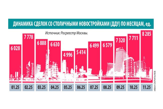 В ноябре 2025 года, согласно данным Росреестра Москвы, рынок строящегося жилья сохранил высокую деловую активность. Всего за месяц было зарегистрировано 8,3 тыс. договоров долевого участия (ДДУ), что на 15% больше, чем в ноябре 2024 года (7,2 тыс. ДДУ). Относительно октября 2025 года (7,7 тыс. ДДУ) спрос вырос на 7%.