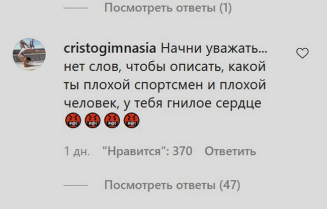 Наконец, ответил и сам шокировавший Навку испанец Бенитес. В комментариях под ее постом он по-русски написал: "Нет слов, чтобы описать, какой ты плохой спортсмен и плохой человек, у тебя гнилое сердце".
