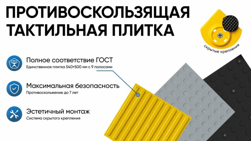 SEO-описание: Противоскользящая тактильная плитка для улицы и соцобъектов. Соответствие ГОСТ Р 52875-2018, размер 540×500 мм, скрытый крепеж, материалы ПВХ и ПУ. Официальный производитель.