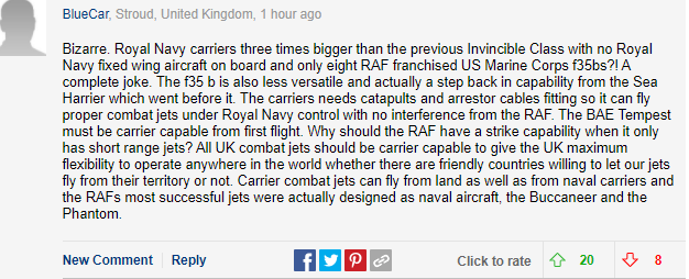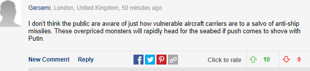 «Если сомнительный авианосец плюс дюжина американских самолетов и вертолетов и несколько кораблей поддержки – это "самая большая морская демонстрация силы", которую может собрать Великобритания, то пришло время признать, что мы больше не являемся мировой державой, и вернуть эти парусники домой. Это не наша борьба, и мы должны сосредоточиться на улучшении нашей судьбы дома. Мы больше не сверхдержава», – заявил еще один британский пользователь.