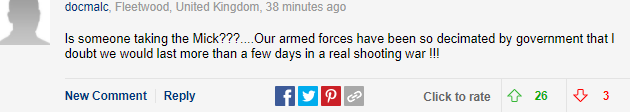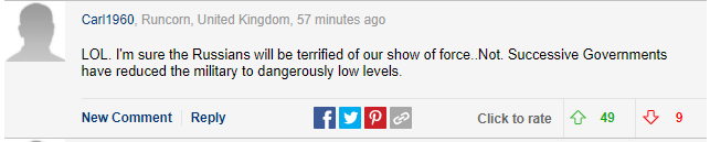 «ЛОЛ. Я уверен, что русские будут в ужасе от нашей демонстрации силы ... На самом деле нет. Сменявшие друг друга правительства сократили численность вооруженных сил до опасно низкого уровня», – сетует один из участников дискуссии.