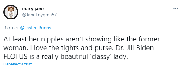 «По крайней мере, ее соски не выглядывают, как у предыдущей первой леди, – написала одна из интернет-пользовательниц. – Мне очень нравятся ее чулки и сумочка. Доктор (в июне 2009 года колледж Кингбороу присудил ей степень доктора гуманитарных наук – прим.ред.) Джилл Байден – по-настоящему красивая, стильная леди».