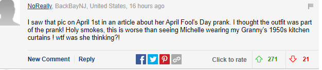 «Я увидел эту фотографию 1 апреля в статье о ее первоапрельской шутке. Я думал, что наряд был частью розыгрыша! – признался еще один комментатор. – Святые угодники, это хуже, чем видеть Мишель (жену Барака Обамы – прим. ред.) в кухонных занавесках моей бабушки 1950-х годов! О чем она только думала?!».