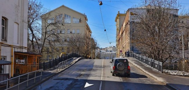 Например: как по проезжей части улицы Казакова в сторону Садового кольца к путепроводу подъезжает курьер с едой. Секунду всматривается в мост. И сворачивает на тот самый тротуар с лестницей: по проезжей части, где носятся по крутому повороту автомобили, на безмоторном велосипеде страшно. Перед лестницей курьер спешивается и закатывает велосипед в горку.