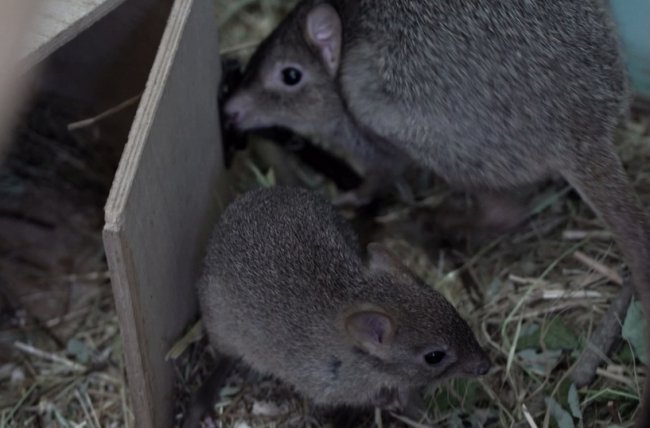 В главном зоосаде страны сообщили о событии без преувеличения мирового значения. Семейка кенгуру, которые относятся к редчайшему вымирающему виду войли (они же щетинохвостые и карманные), пополнилась — на свет появился малыш, которого зоологи смогли разглядеть только сейчас. С начала весны и до недавнего времени мама прятала его в сумке, и он питался только ее молоком. Но совсем недавно самка позволила детенышу показаться людям, и тот начал есть взрослую пищу: листья, траву, ветки и грибы, однако постоянно возвращался в свою сумку. Но сейчас все поползновения чада мама начала пресекать. По словам работников зоопарка, это закономерная последовательность событий — у войли обычно появляются три детеныша один за другим. Когда самка выпускает старшенького на волю, у нее в сумке «заводится» следующий, а в это время в утробе зреет третий.