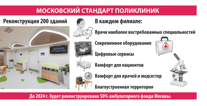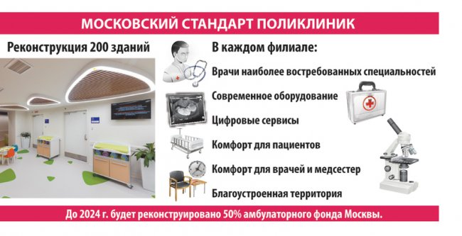 Продолжается модернизация московских поликлиник по новому столичному стандарту. «Жители получают в старом здании совершенно новую, ультрасовременную поликлинику с полным спектром медицинских услуг, — подчеркнул Сергей Собянин. — Будет открыто порядка 30 новых поликлиник в районах, где их объективно не хватает. <…> Количество поликлиник под комплексную реконструкцию увеличено до 200 зданий».