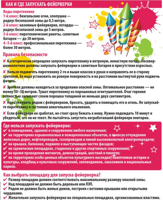 Спасатели напоминают: нельзя курить рядом с фейерверком, бросать, ударять и помещать его в огонь. Не запускайте пиротехнику в состоянии алкогольного опьянения. Если фейерверк не сработал, не стоит сразу бежать к нему. Нужно подождать 10 минут и убедиться, что он не тлеет. Не пытайтесь запустить несработавший фейерверк повторно.