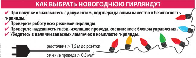 «Лампочки в гирляндах должны быть мощностью не более 25 Вт. При этом электропровода, питающие лампочки елочного освещения, должны быть гибкими, с медными жилами. Электропровода должны иметь исправную изоляцию и подключаться к электросети при помощи штепсельных соединений. При неисправности елочного освещения (сильное нагревание проводов, мигание лампочек, искры) иллюминация должна быть немедленно отключена и не включаться до выяснения неисправностей и их устранения», — цитируют СМИ рекомендации представителей МЧС.
