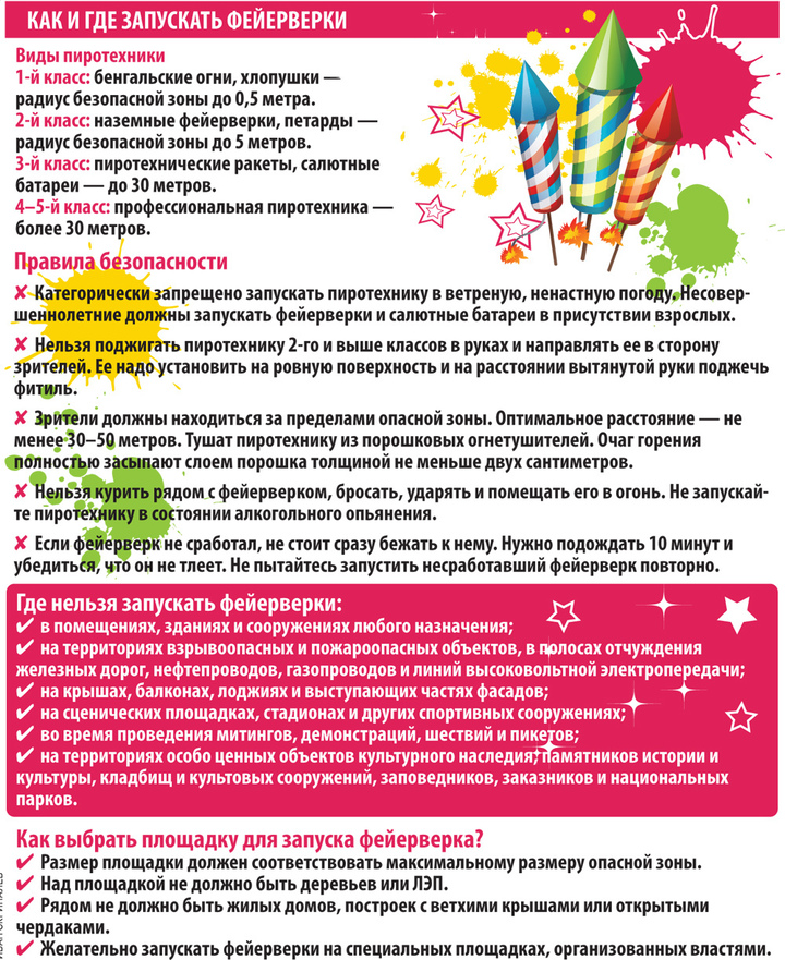 Специалисты не рекомендуют использовать пиротехнику на улице при ветре более пяти метров в секунду — так возникает риск, что даже со специально выделенной площадки фейерверк может улететь в сторону и попасть, например, на балкон жилого дома. Даже в морозную погоду возгорание начинается моментально, и потушить его своими силами — без огнетушителя! — фактически невозможно.