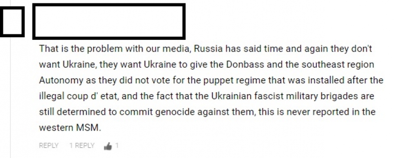 «В этом проблема наших СМИ, Россия снова и снова заявляет, что они не хотят Украины, они хотят, чтобы Киев предоставил Донбассу и юго-восточному региону автономию, поскольку они не голосовали за марионеточный режим, который был установлен после незаконного переворота. А о том, что украинские фашистские военные отряды по-прежнему полны решимости совершить против них геноцид, об этом никогда не сообщается в западных СМИ», — заявил читатель Daily Mail.