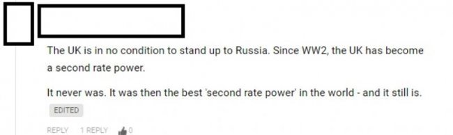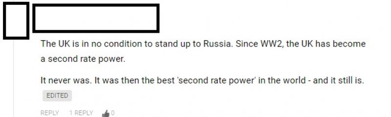 «Великобритания не в состоянии противостоять России. После Второй мировой войны Британия превратилась во второсортную державу. Она никогда не могла этого делать. Она тогда и сейчас продолжает оставаться лучшей "второсортной державой" в мире», — констатировал местный эксперт.