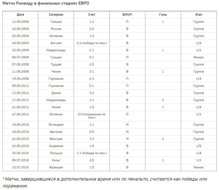 1. Роналду провел 21 матч в финальных стадиях Евро. После дебюта на турнире в 2004 году форвард пропустил только одну игру — заключительный тур группового этапа Евро-2008. И то, только потому, что португальцы гарантировали себе место в плей-офф досрочно, и игра со Швейцарией ничего не значила.