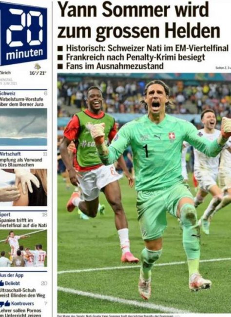 Швейцарская ежедневная газета 20 Minuten смаковала победу национальной команды над Францией. Больше всего восхищались вратарем Янном Зоммером, отразившим пенальти от Килиана Мбаппе.