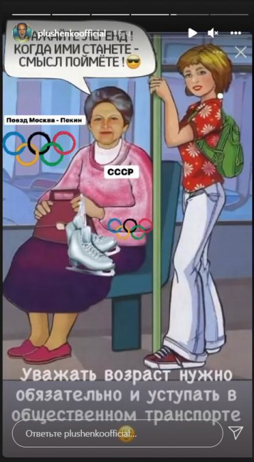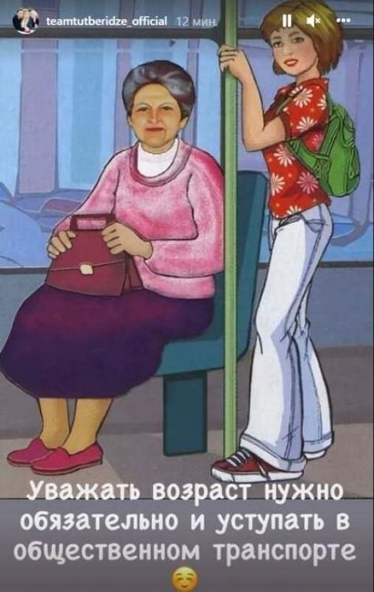 А вот команда Этери Тутберидзе отреагировала на предложение Жулина шуткой: «Уважать возраст нужно обязательно и уступать в общественном транспорте». В сторис Инстаграма появилась фотография, на которой молодая девушка уступает пожилой женщине место в автобусе.